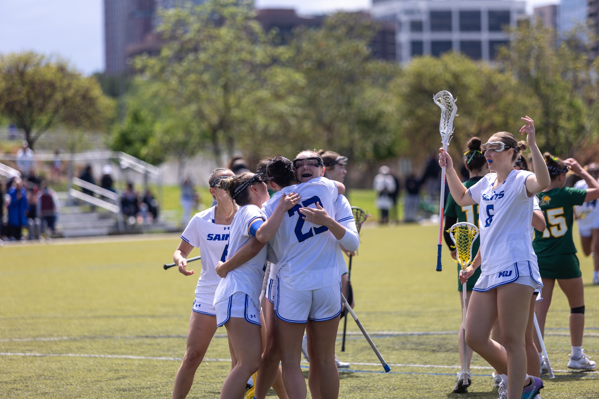 Marymount took a slim 5-2 lead after the first quarter of play before the Saints exploded for eight goals in the second frame. MU opened the period with three consecutive goals before a five-goal run pushed the Saints ahead, 13-3. Southern Virginia clawed one goal back at the end of the half, but the Blue and White continued the pressure on the other side of the halftime break.